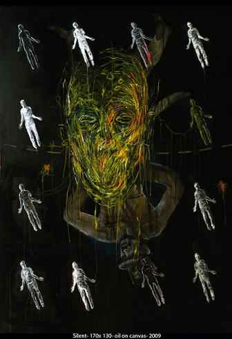 در دیگر آثار مشاهده میکنیم که جریانهای حاشیهای همان جریانهایی هستند که در حاشیه فرهنگی به وجود میآیند و دائما در تضاد با زبان و هنجار هسته خودنمایی میکنند. در فضاهای حاشیهای نشانهها پررنگتر؛ و شاید به تعبیری نشانهتر میشوند. هر چند در فضای غیر حاشیهای باز نشانهها نشانهاند و همچنان دلالت میکنند اما ممکن است کل را دچار چالش کنند. در یکی از آثار، هنرمند به مثابه میهمانِ متن در غشایی از حاشیه و هسته حضور مییابد. این حضور وجه فرازبانی دارد. خسروی با این حضور سمیوسفری تازه به وجود میآورد. فضای اثر فراتر از محیط هر کدام، دارای توانایی و ویژگی است که از آن میتوان به ویژگی فرازبانی تعبیر نمود.